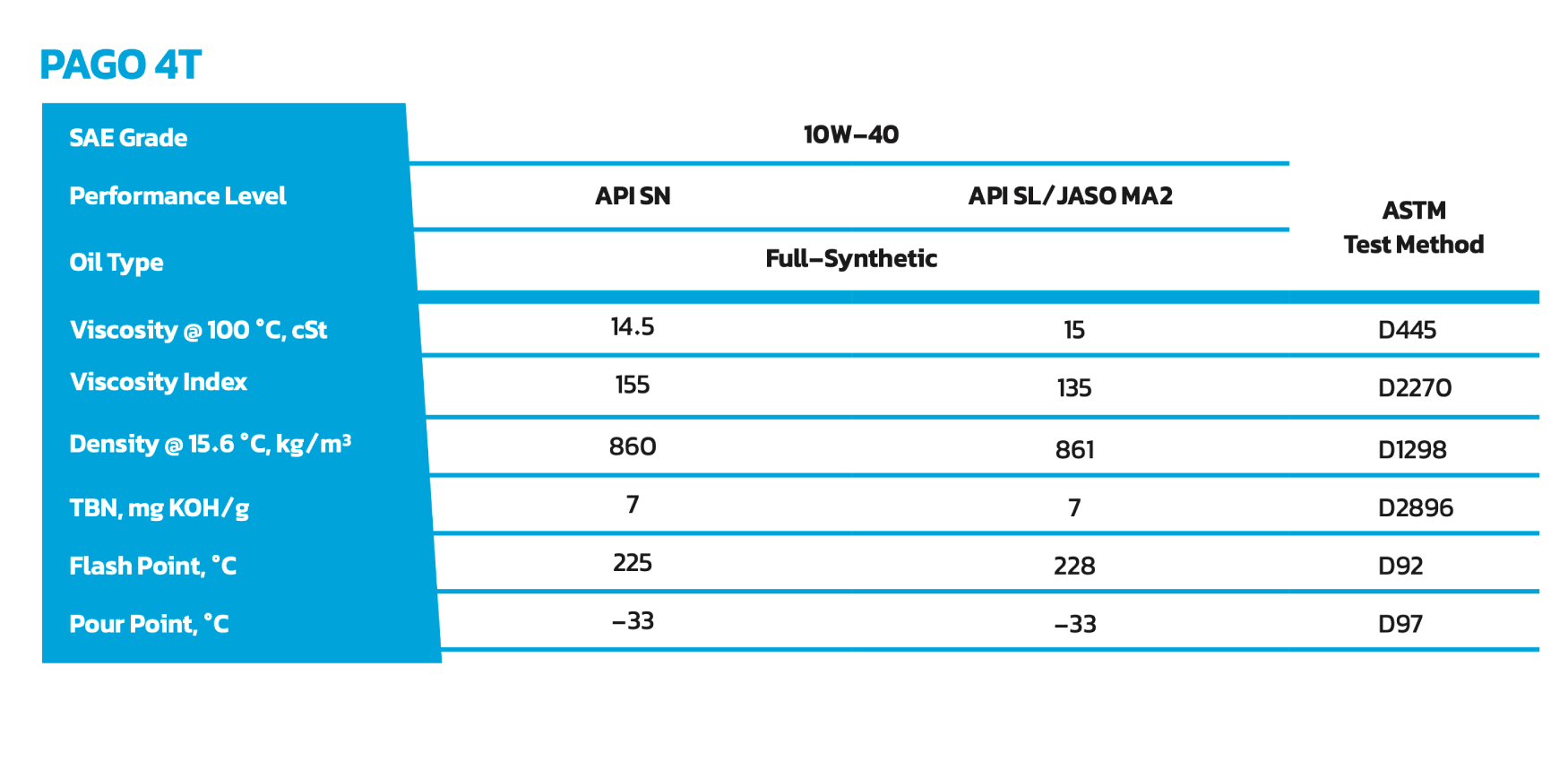 پاگو 4T در درجه ویسکوزیته 10W-40 موجود است و قابل تولید در دیگر درجات گرانروی نیز میباشد.
