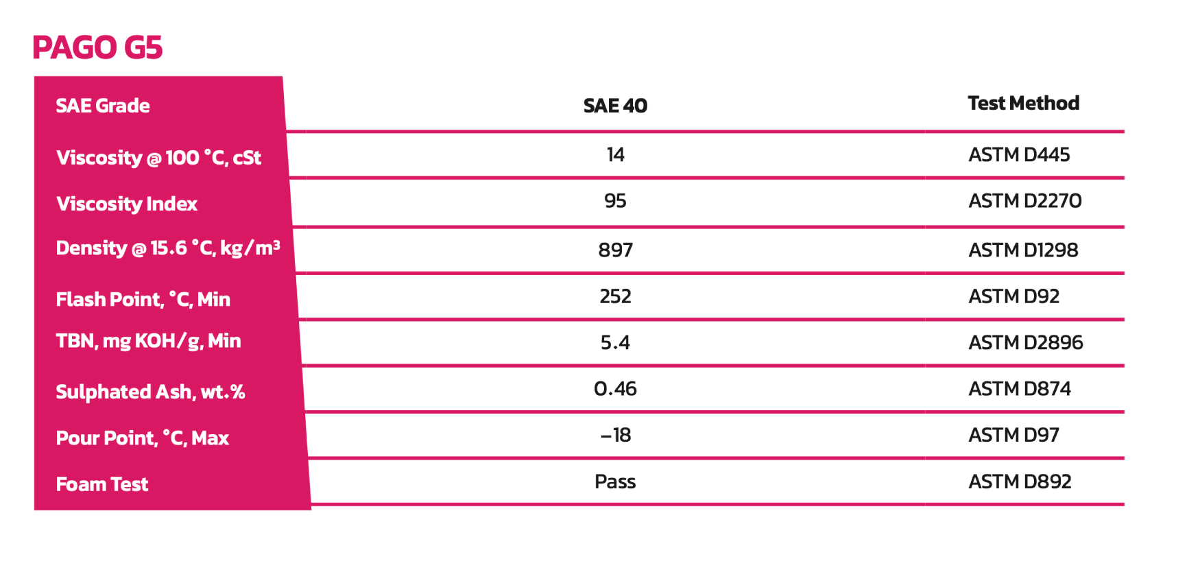پاگو G5 روغن موتور با خاکستر سولفاته کم است که برای روانکاری موتورهای ثابت گازسوز تولیدشده توسط تمام شرکتهای پیشرو در ساخت این نوع از موتورها، که با گاز طبیعی کار میکنند، طراحی شده است. پاگو G5 با هدف تامین بیشترین محافظت از موتور در برابر سایش و خوردگی، با استفاده از روغن پایههای بهخوبی تصفیه شده و ادتیوهای ویژهای که منطبق با الزامات عملکردی CES 20074 و API CF Cummins میباشند، فرموله شده است. پاگو G5 در موتورهای ثابت گازسوزی که به روغنی با خاکستر سولفاته کم نیاز دارند، دارای بهترین عملکرد میباشد.