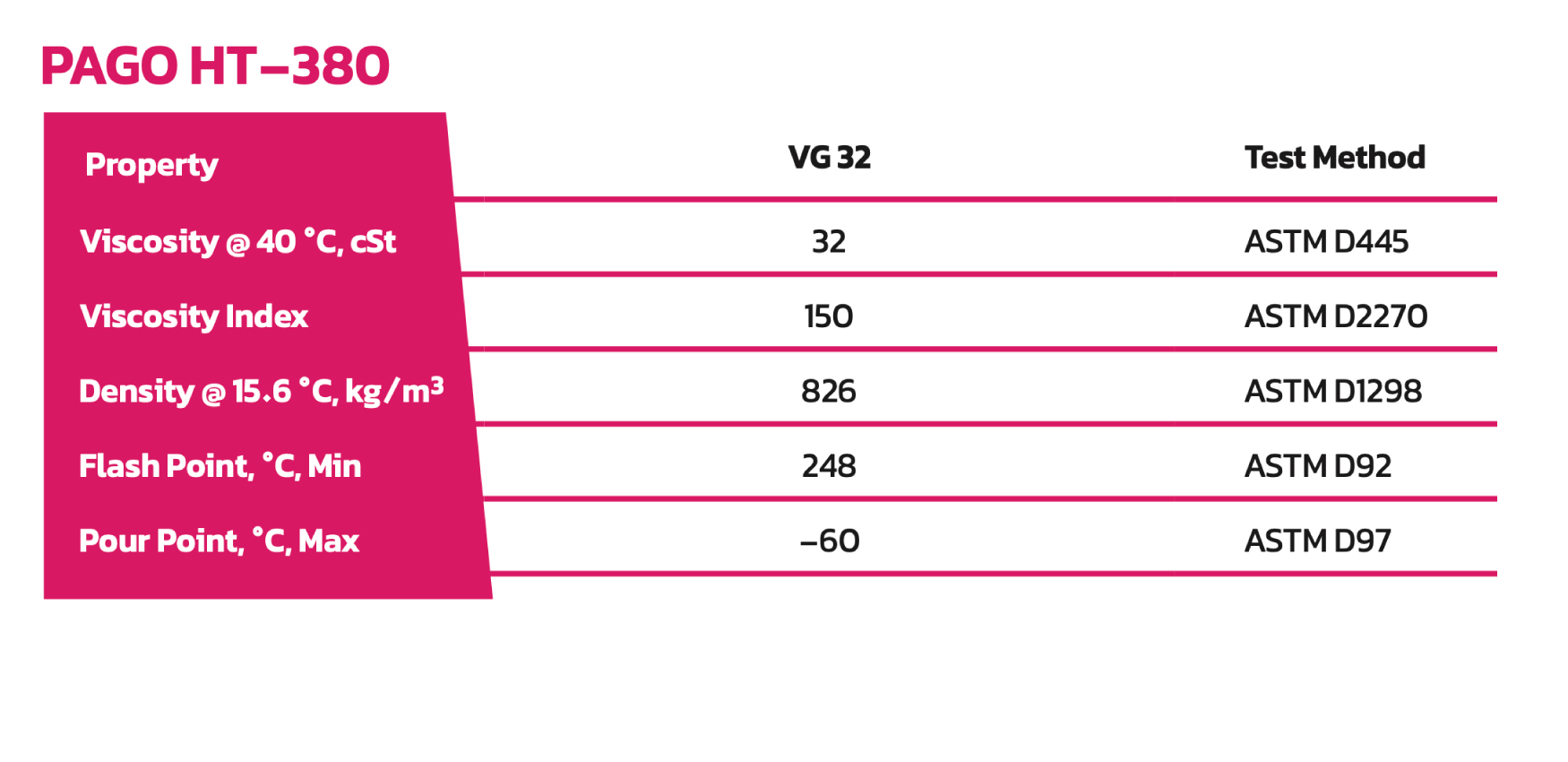 پاگو HT-380 روغن انتقال حرارت تمامسنتزی بدون بو و غیرسمی است که برای استفاده در سیستمهای بستهای که به روغنی ایمن و بسیار پایدار با عملکردی عالی در رنج وسیعی از دما (60- تا 380 درجه سانتیگراد) نیاز دارند، طراحی شده است. همچنین پاگو HT-380 جهت استفاده در سیستمهای باز که دمای مجاز فیلم روغن 340 درجه سانتیگراد است، قابل استفاده میباشد. پاگو HT-380 با استفاده از روغن پایههای تمامسنتزی PAO (پلی آلفا اولفین) با کیفیت فوقالعاده بالا و ادتیوهای پیشرفته، با هدف تولید محصولی با پایداری اکسیداسیونی و حرارتی استثنایی، میزان تبخیر بسیار کم، انتقال حرارت بسیار سریع، و شاخص ویسکوزیته بسیار بالا فرموله شده است