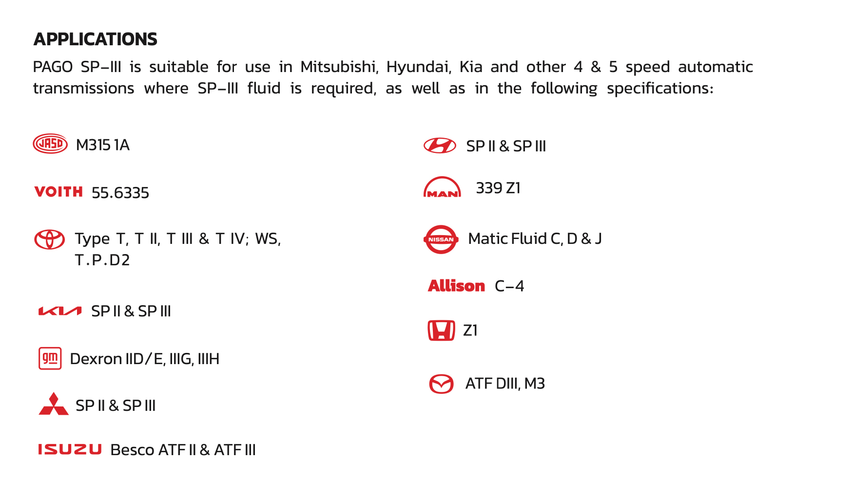 پاگو SP-III برای استفاده در گیربکسهای اتوماتیک چهار و پنج سرعته شرکتهای خودروسازی Mitsubishi، Hyundai و Kia که نیاز به روغنی با مشخصات عملکردی SP-III و یا مشخصات عملکردی زیر دارند، مناسب میباشد.