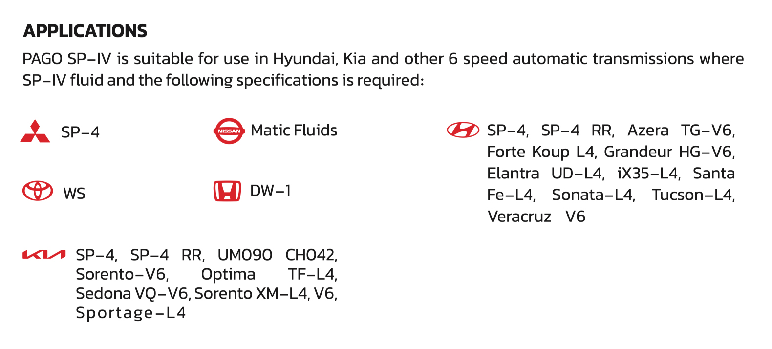 پاگو SP-IV برای سیستمهای گیربکس اتوماتیک ششسرعته خودروهای سواری Hyundai و Kia که به روغنی با مشخصات عملکردی SP-IV، و سایر خودروهایی که به روغن دندهای با مشخصات زیر نیاز دارند، مناسب میباشد.