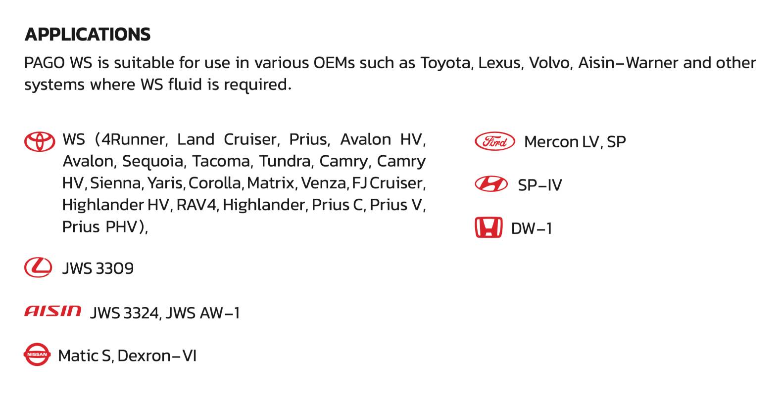 پاگو WS برای استفاده در گیربکسهای اتوماتیک خودروهای تولید شده توسط شرکتهای Toyota، Lexus، Volvo، و سایر گیربکسهایی که در آنها استفاده از روغن دنده اتوماتیک با مشخصات عملکردی WS الزامی میباشد، مناسب است. همچنین پاگو WS الزامات زیر را پوشش میدهد.